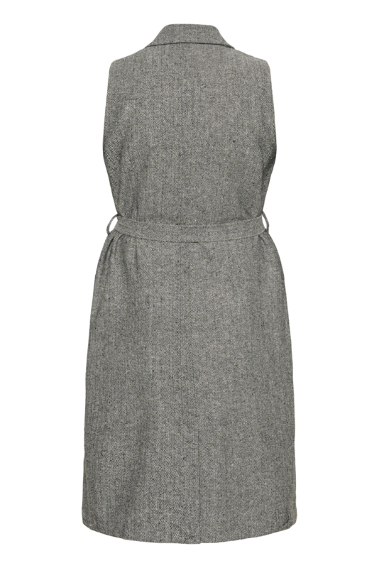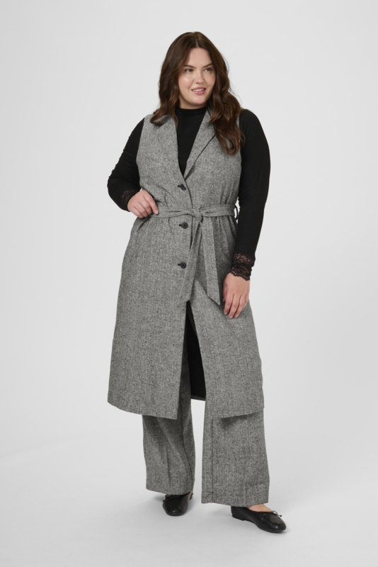 Toffe lange waistcoat in een klein V patroontje. De waistcoat heeft een kraag en sluit met 3 knopen. Verder heeft de waistcoat een striklint in de taille en steekzakjes. Super tof met de bijpassende broek.