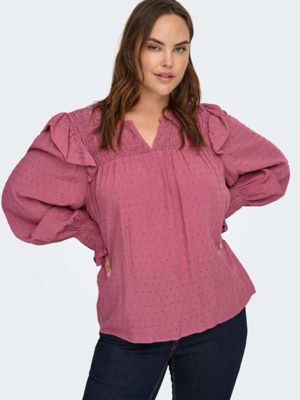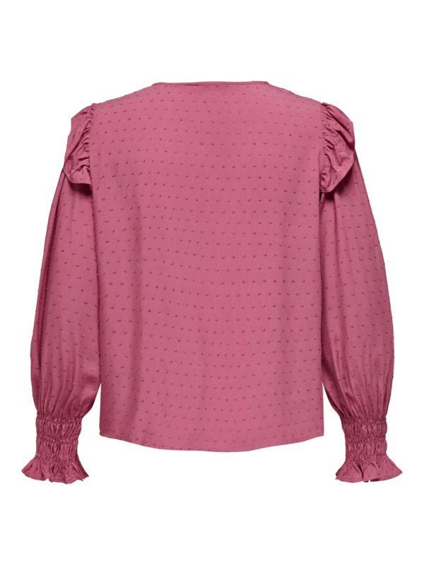 Leuke blouse van viscose met een nopje in de stof. De blouse heeft een v-halsje en smock op het schouderdeel en aan de manchetten. Verder heeft de blouse een ruffle langs de kop van de schouder. Leuk op een jeans en mooi te combineren met trendkleur bordeauxrood.