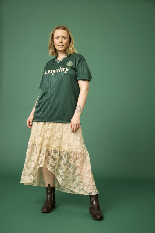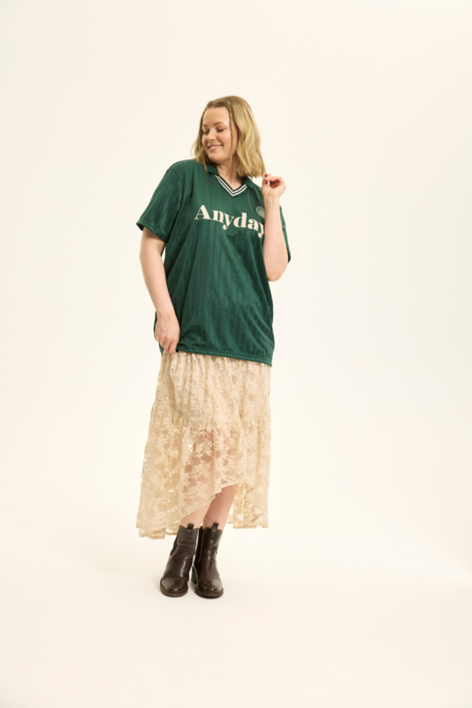 Super trendy rok in kant. De rok heeft een elastische band in de taille en is gevoerd tot aan de knie. Super tof met het bijpassende shirt of een stoer sports tee!