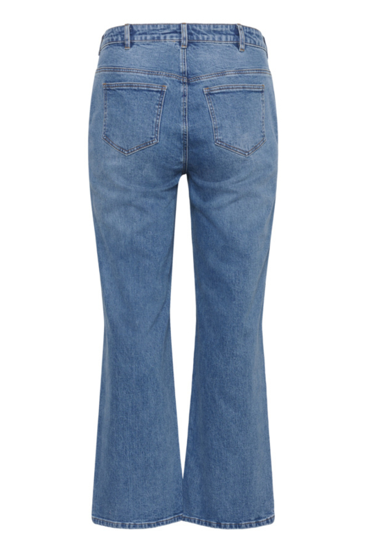 Jeans in een mediumblauwe kleur. De jeans heeft een wijde pijp en een hoge taille. Super leuk te combineren met het bijpassende jasje.