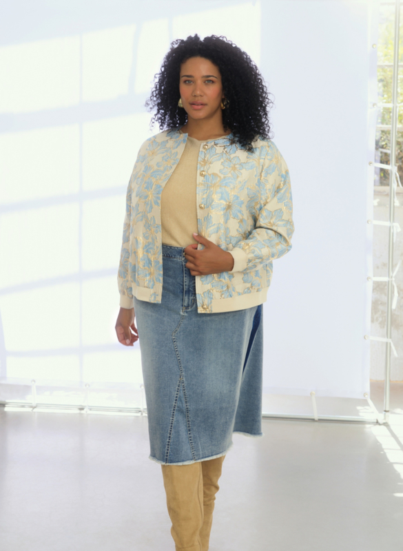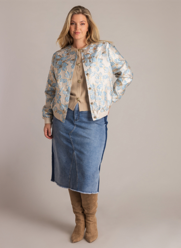 Jackje in een bombermodel met een toffe print. Het jasje heeft een ronde hals en gouden knopen. Onderaan het jasje en aan de mouwen zit een off white boord.