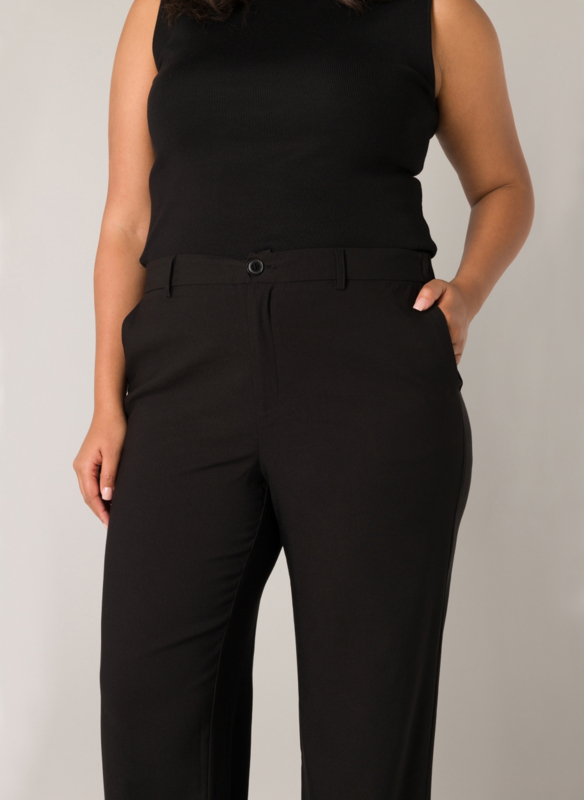 Mooie basic pantalon in een klassiek wijd model met een wijde pijp. De broek heeft een knoop en ritsafsluiting en elastiek achter in de band.