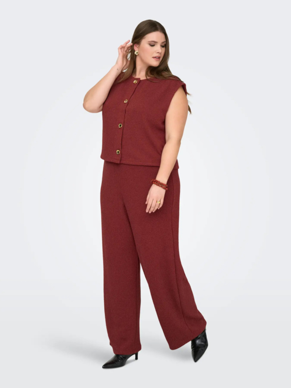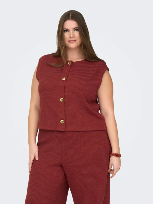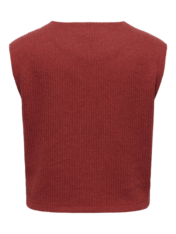 Roestkleurig giletje met gouden knopen en een ronde hals. Leuk op de bijpassende broek als setje te dragen!