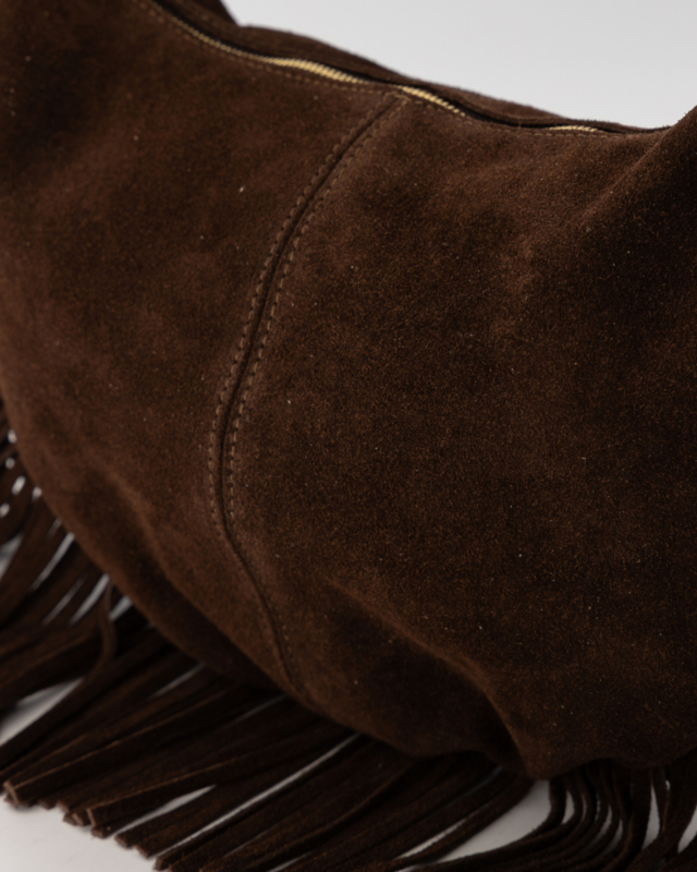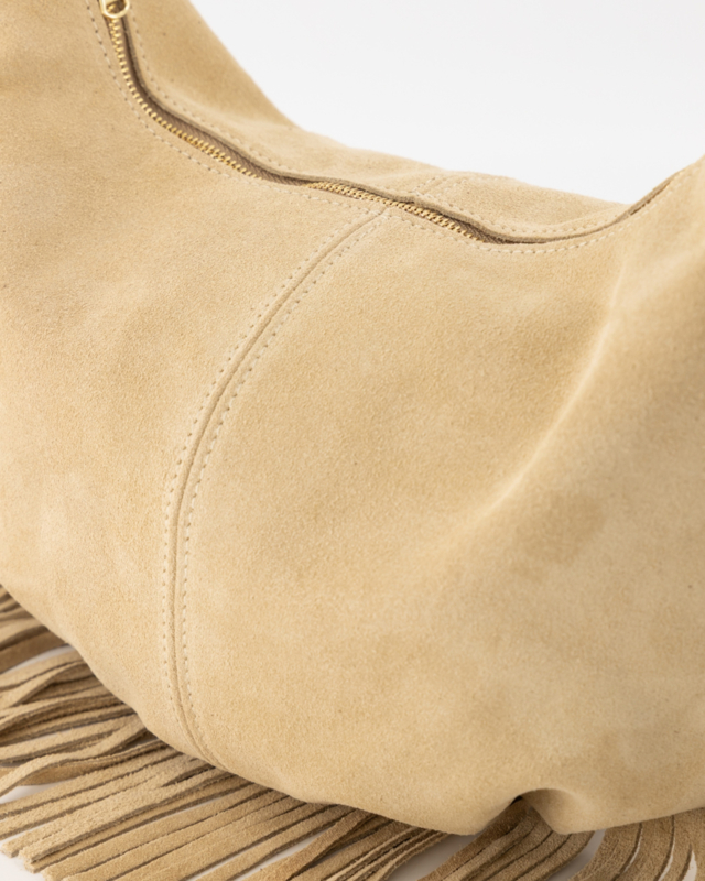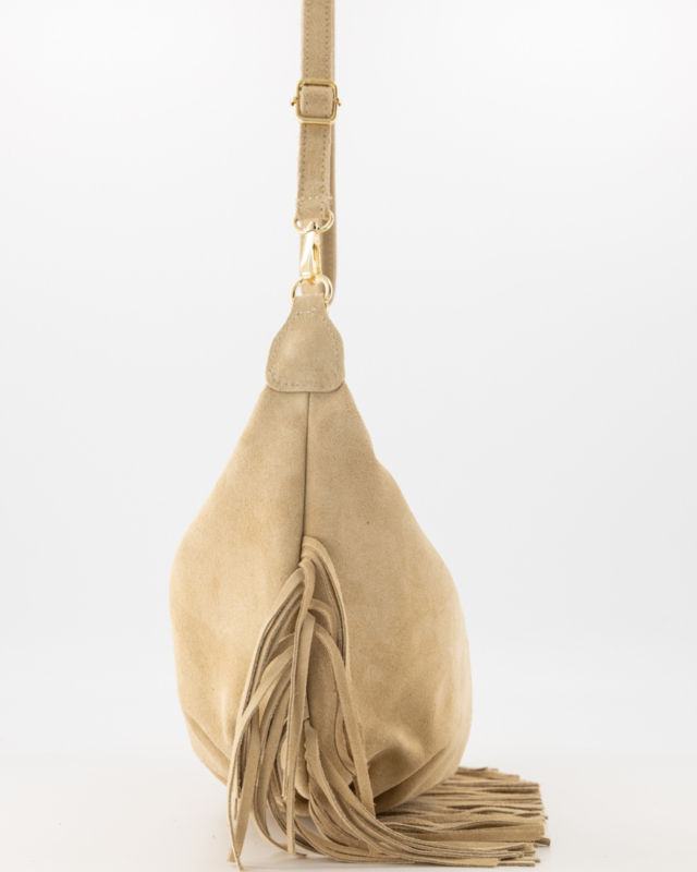 De Vromy suede crossbody tas is vervaardigd van echt leren suede en combineert stijl met functionaliteit. De modieuze franjes geven de tas een trendy uitstraling, terwijl de goudkleurige hardware zorgt voor een luxe afwerking.