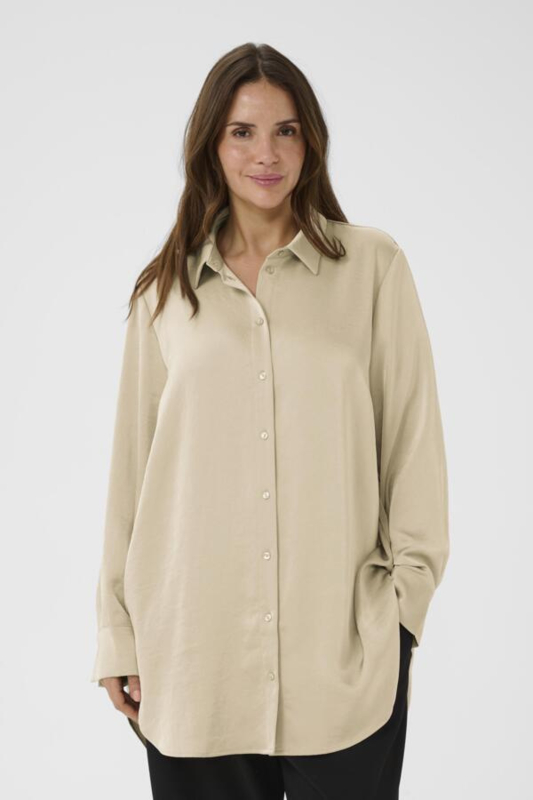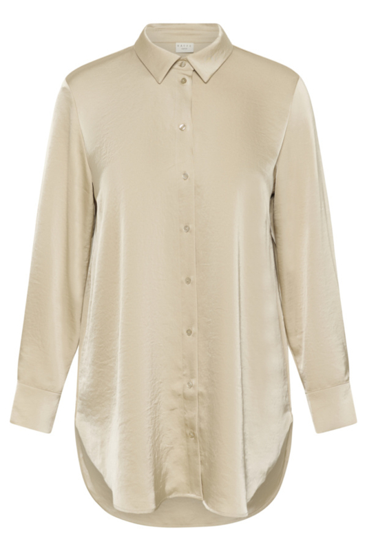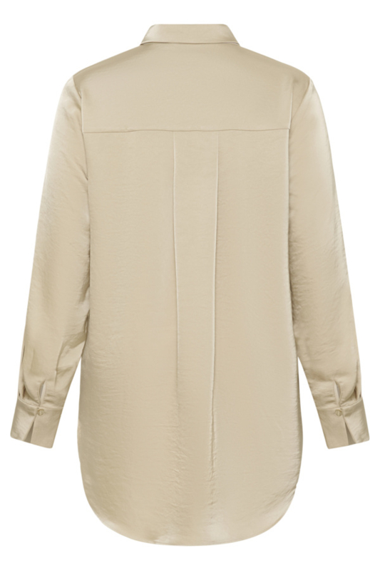 Langere blouse in een glanzende stof. De blouse heeft een kraagje, is helemaal doorknoop en heeft een lange mouw met manchette.