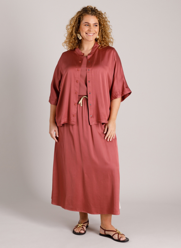 Tof blouse/jasje in een mooie donkerroze kleur. Het blousje heeft een ronde hals en een 3/4 mouw. Het blousje sluit met drukknopen en is ook super leuk op de bijpassende rok.