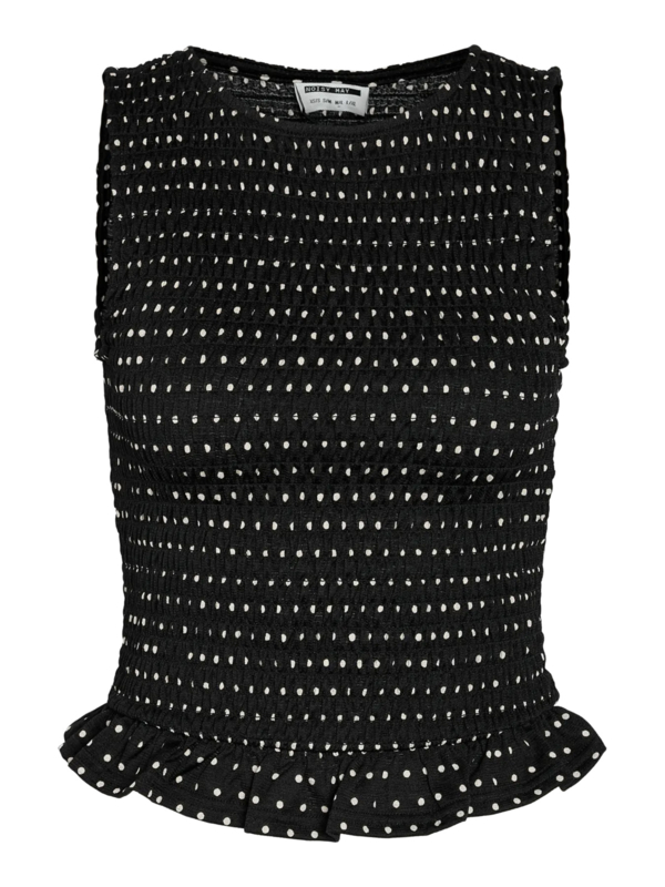 Super leuke gesmockte top met een stipje. De top is mouwloos en heeft aan de onderkant een klein ruffeltje.