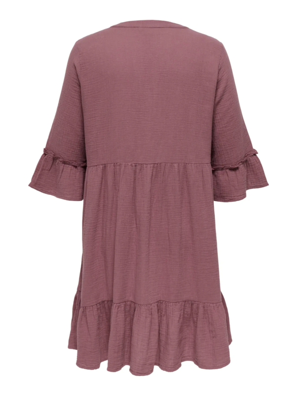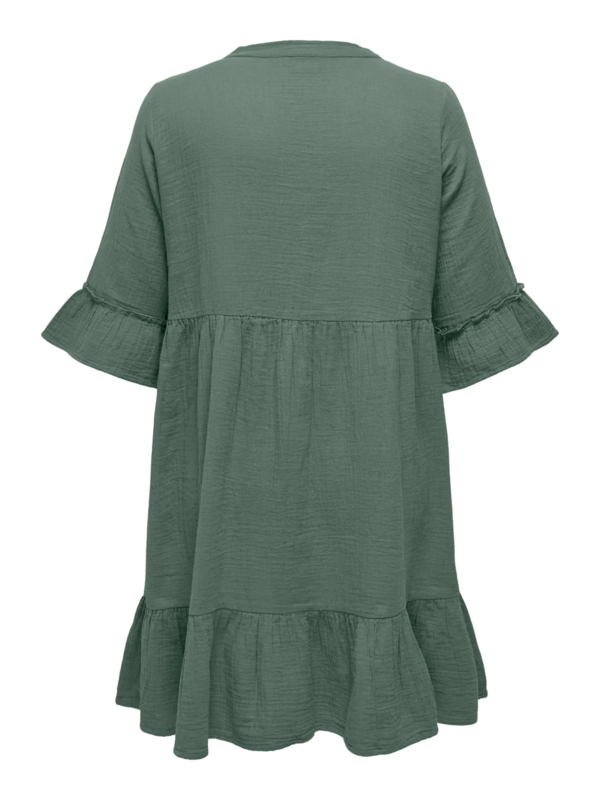Lekker jurkje met een v-hals en een 3/4 mouw met een ruffle. Het jurkje heeft een losvallende onderkant met strook.