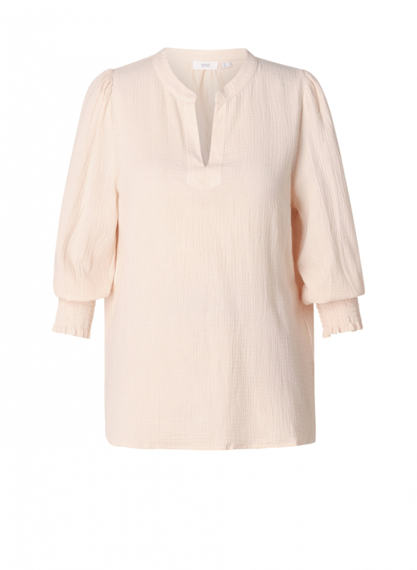 Mooie blouse in een mousseline stof met een glitterdraadje in de stof. De blouse heeft een v-hals en een 3/4 mouw met elastiek.