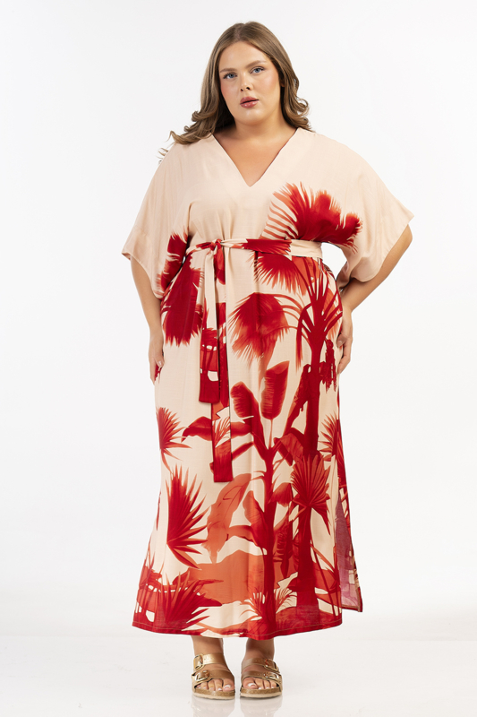 Prachtige jurk die met een zomerse print in rood of zwart op een offwhite ondergrond. De jurk heeft een v-hals en een striklint in de taille. In dezelfde print is ook een jumpsuit beschikbaar.