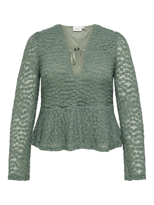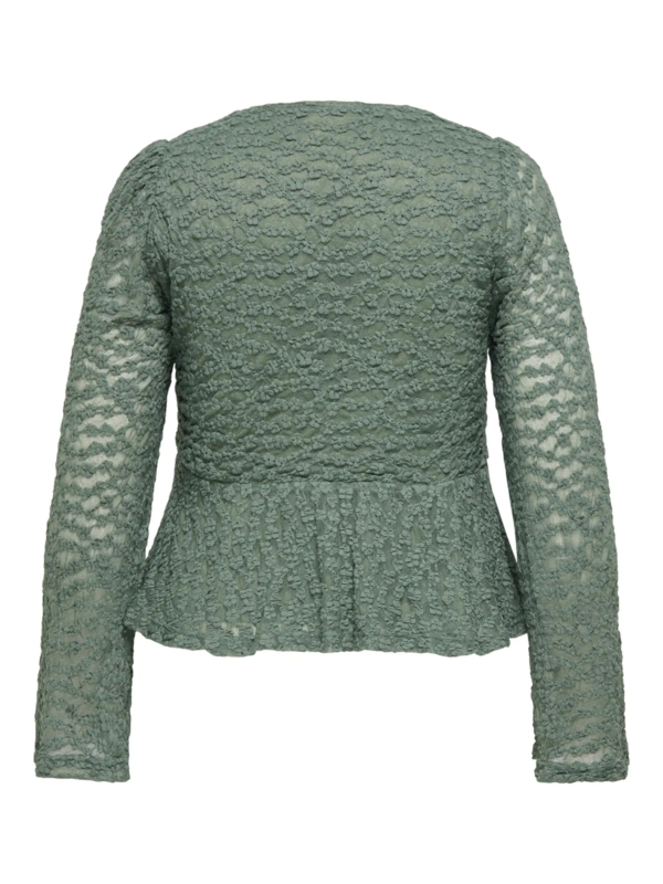 Toffe kanten top in een prachtige groene kleur. De top is gevoerd op het lijf, heeft een v-hals met een strikje en een lange mouw. Vanuit de taille loopt de top uit in een peplum. De top is ook andersom te dragen zodat je een hoge ronde hals aan de voorkant hebt. Super leuk met de bijpassende rok!