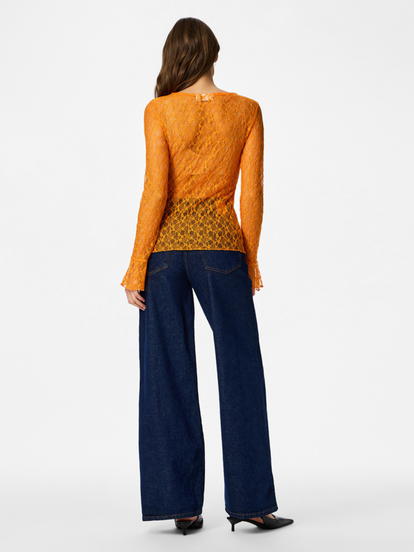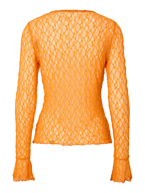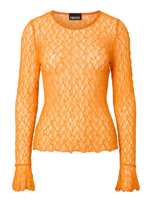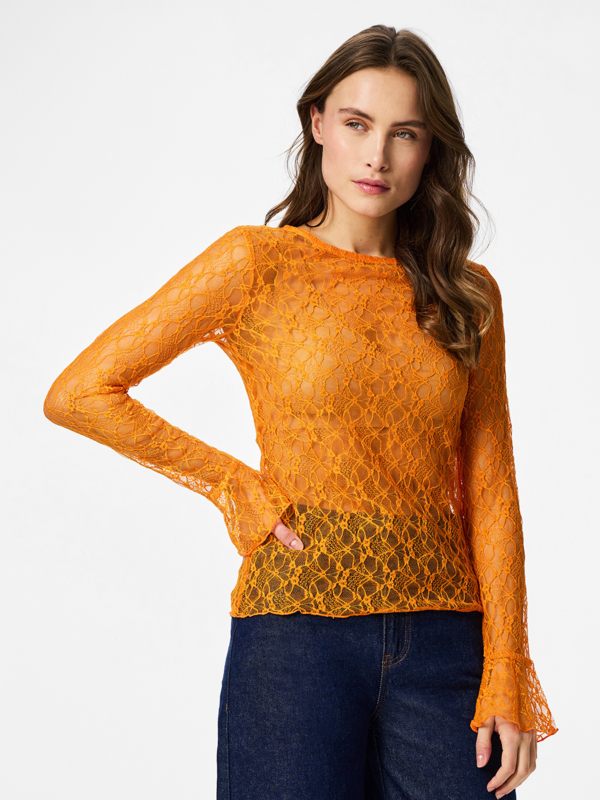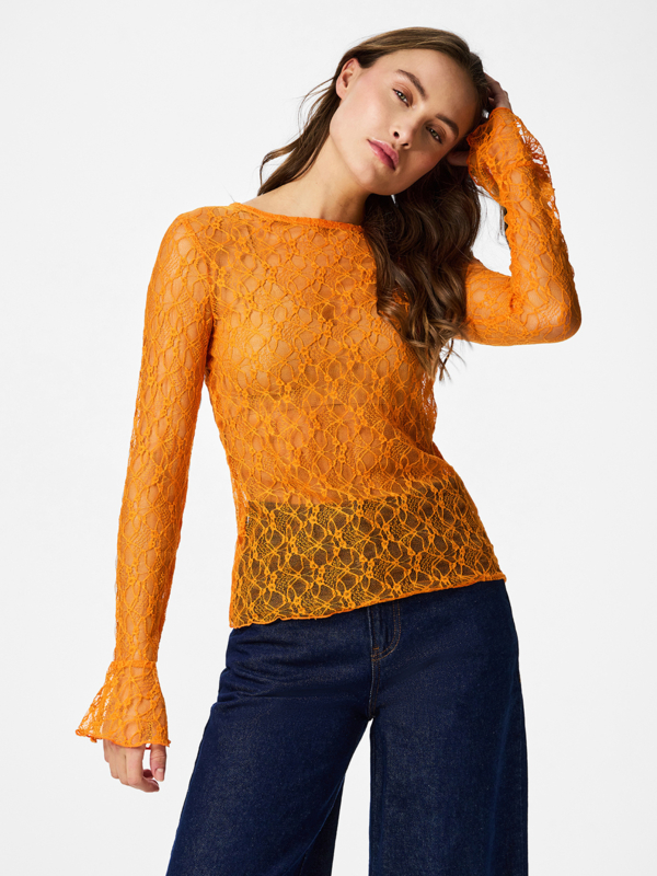 Oranje boven! Speciaal voor Koningsdag komt Pieces met een toffe kanten top in onze nationale kleur: oranje! De top bevat lekker veel stretch, heeft een ronde hals en lange mouwen met een trompetmanchet. Hoe leuk om dit te dragen met een blazer, waar dan je manchet nog onderuit piept, een gilet of natuurlijk gewoon zo op je jeans met een hemdje eronder. Happy Kingsday!