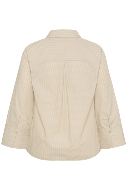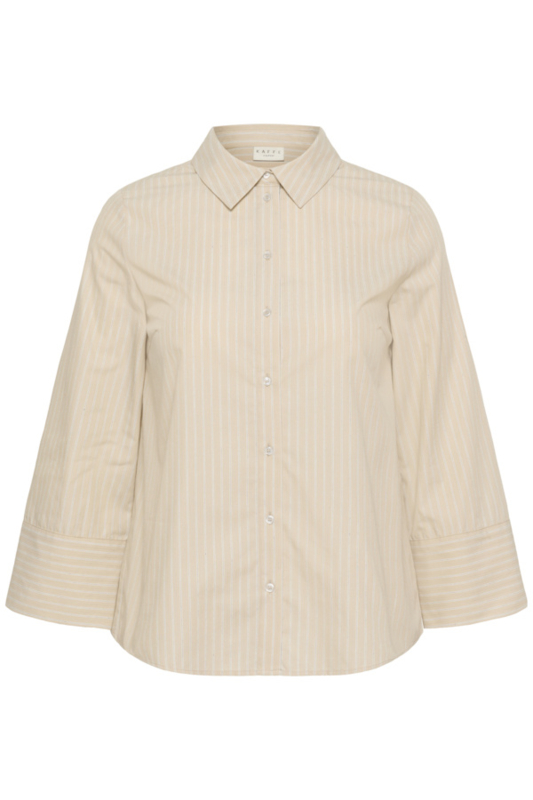 Toffe blouse van Kaffe Curve met een streepje. De blouse heeft een kraagje en een wijde mouw. Verder heeft de blouse over de hele lengte knoopjes en een plooi op de rug.
