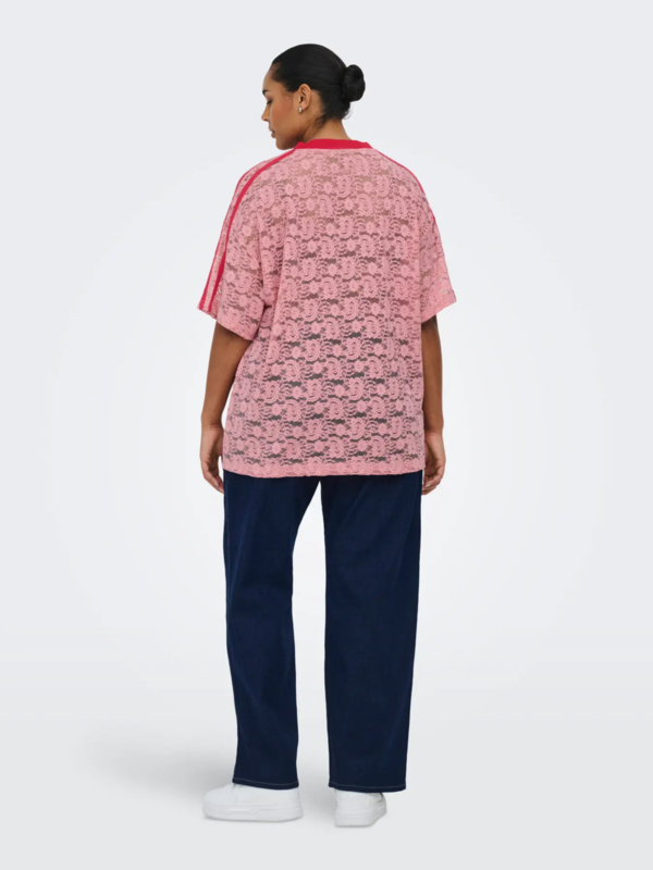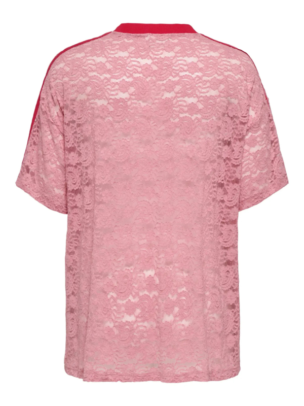 Super tof 'sports tee' van kant in een lekkere girly roze kleur. De top heeft een v-hals en een korte mouw. Super leuk op een jeans(short)!