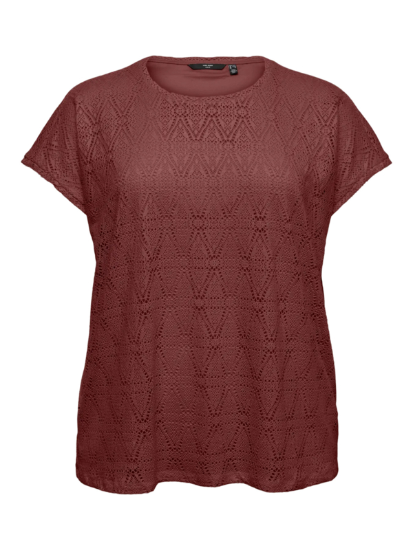 Toffe opengewerkte top in een roestkleur. De top heeft een ronde hals en een aangeknipte mouw. De top is gevoerd op het lijf. Super leuk in combinatie met de bijpassende broek!