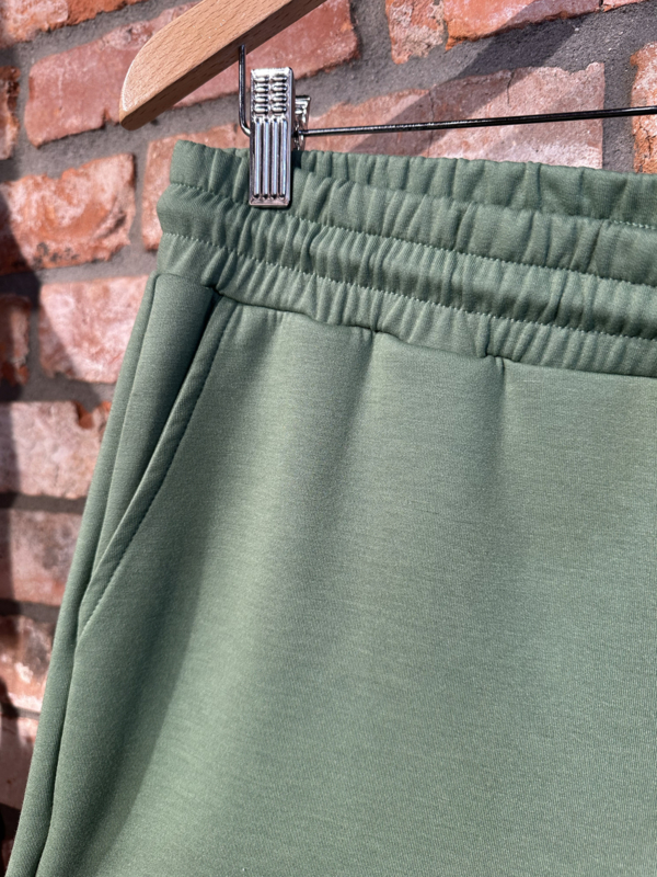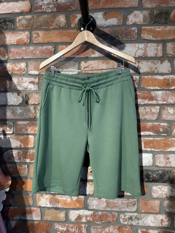 Short van Zhenzi in een heerlijke zachte stretch stof. Het broekje heeft een elastische band met tunneltje, steekzakken en een langere pijp. Draag met het bijpassende shirt voor een sportieve maar comfortabele look. Verkrijgbaar in groen en camel.
