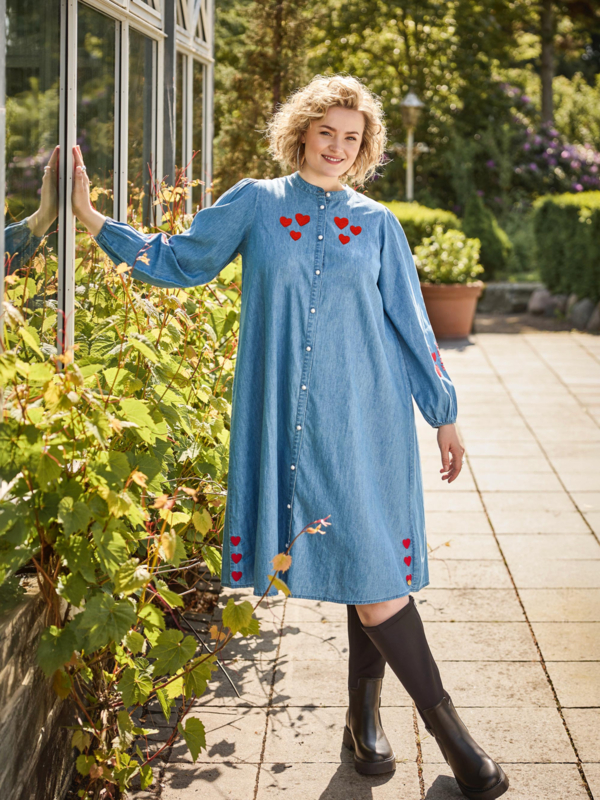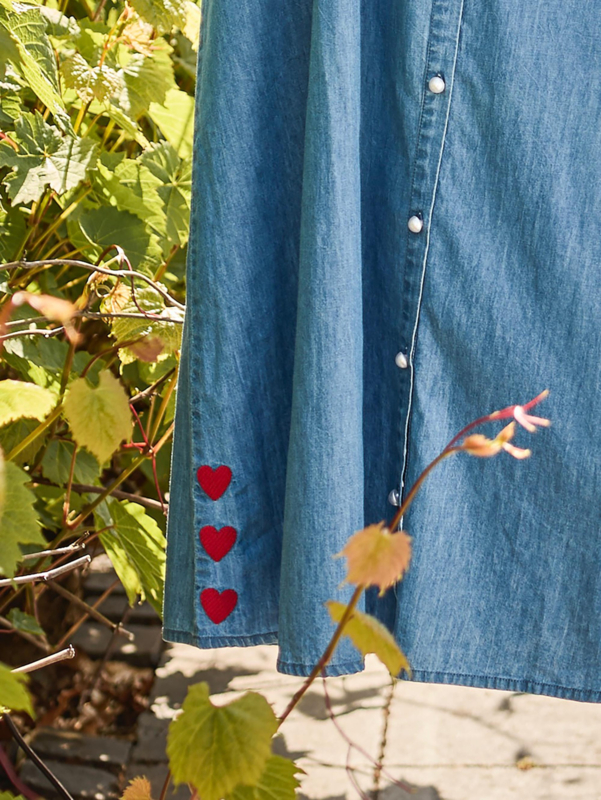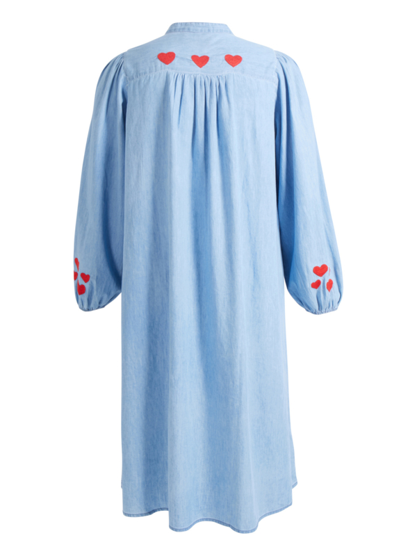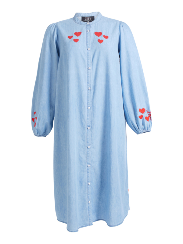 Toffe spijkerjurk van Zoey met geborduurde hartjes. De jurk heeft een ronde hals, knoopjes over de hele lengte en een lange mouw met elastiek.