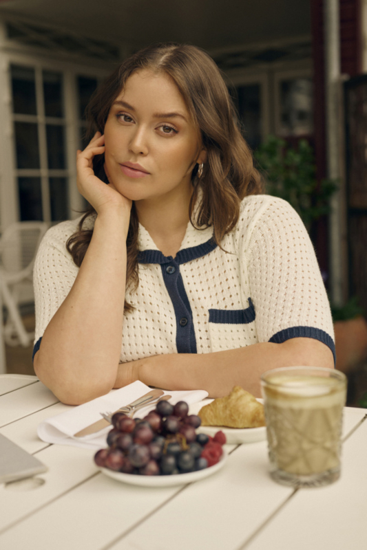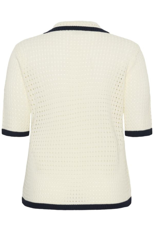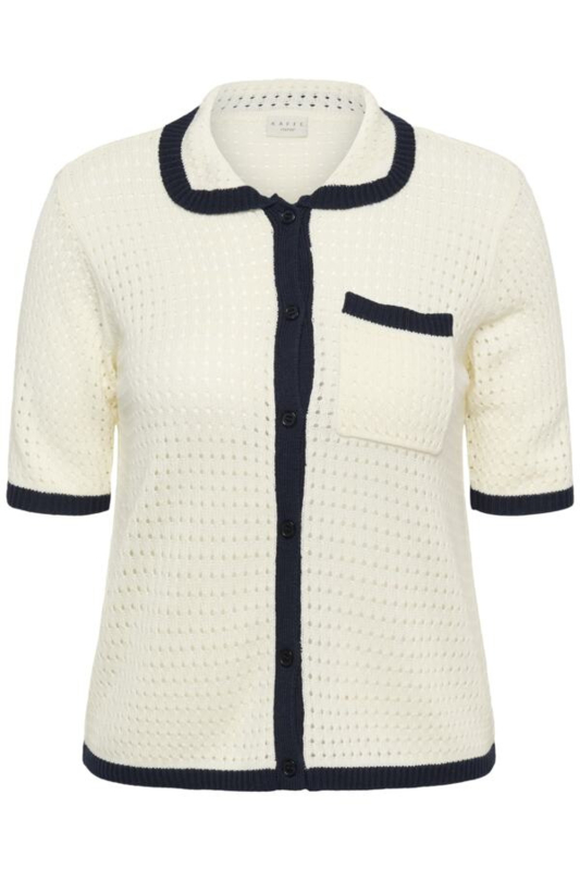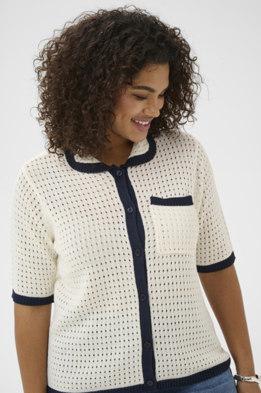 Mooi vestje in een klassiek model met donkerblauwe details langs de randen. Het vestje heeft een kraagje, korte mouwen en een bortszakje. Leuk op een jeans met een sneaker of loafer.