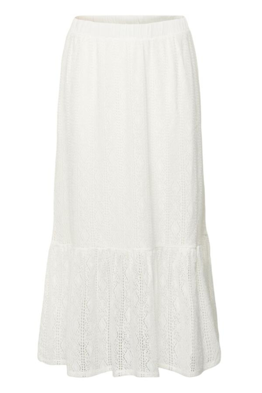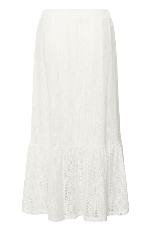 Toffe rok van een kanten stof met elastiek in de taille. De rok heeft een A-lijn model en een strook onderaan.