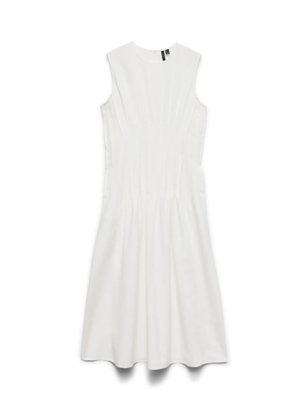 Toffe mouwloze witte jurk met een prachtige pasvorm. De jurk heeft plooien in de taille waardoor de rok mooi wijd uitvalt. Verder heeft de jurk een ronde hals met een knoopje in de nek.