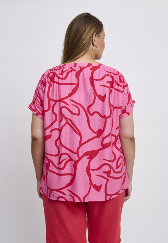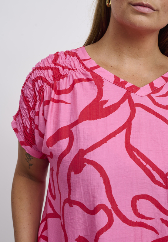 Bloesje met een v-hals en mooie rood/roze print. De blouse heeft een aangeknipte mouw.