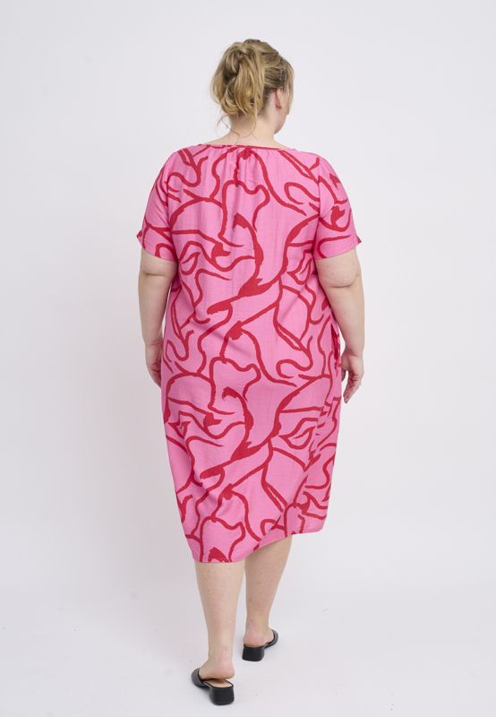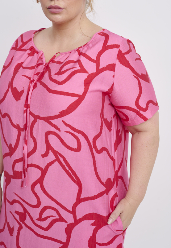 Jurk met een mooie rood/roze print. De jurk heeft een ronde hals en korte mouw.