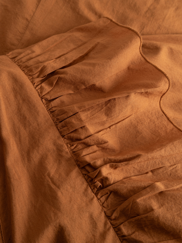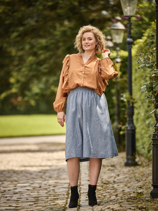 Leuke blouse van Zoey in een katoenen stof in trendkleur henna. De blouse heeft een ruffle over de schouder en lange mouwen en mooie knopen. Leuk te combineren met rok Selma van Zoey.