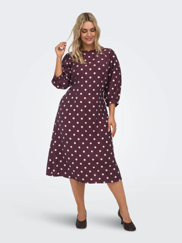Jurkje in bordeaux met een lilakleurige polkadot. De jurk heeft een ronde hals en een 3/4 mouw met elastiek. Achter op de rug heeft de jurk elastiek waardoor je een mooie taille krijgt zonder een striklint te gebruiken.