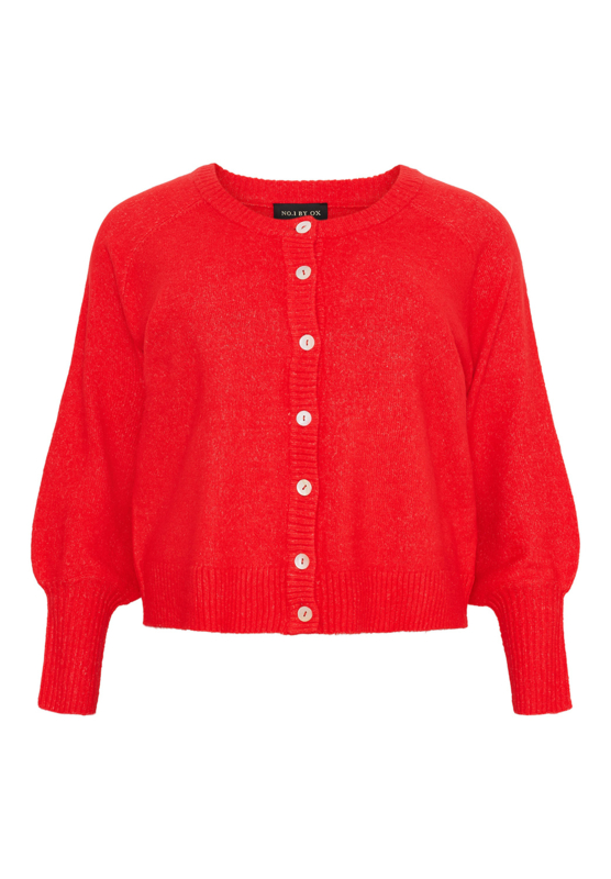 Gebreid vestje SpringGebreid vestje van No. 1 by Ox met ballonmouwen en verlengde manchetten. Het vestje heeft knopen en een ronde hoge hals.