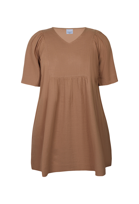 Jurkje CocoKatoenen jurkje in donkerbruin met knoopjes over de hele lengte. De jurk heeft een v-hals met een kraagje en een 2/4 mouw.