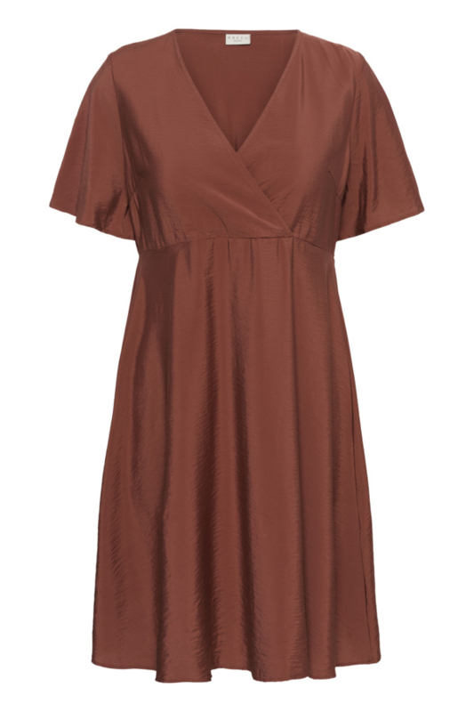 Mooie jurk in een hennakleurige stof van Kaffe Curve. De jurk heeft een overslag bij het decolleté en een wijd uitlopende rok. De jurk heeft een vlindermouw en een midi lengte.€ 79,95