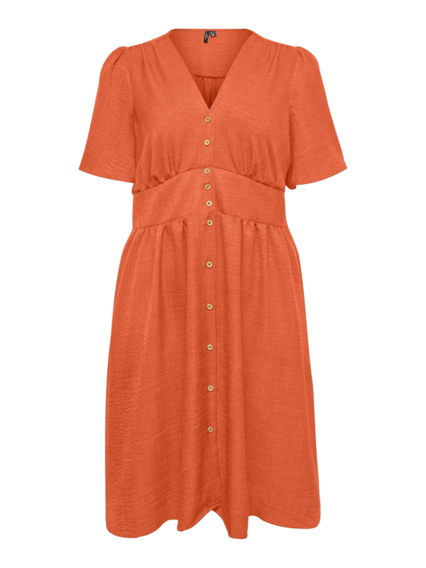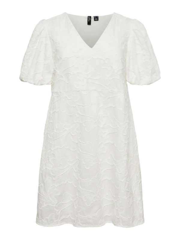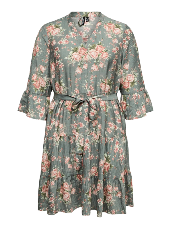 Jurkje CannJurkje van Vero Moda Curve in katoen met een bloemenprintje die op de stof ligt. Het jurkje heeft een v-hals een korte pofmouw en loopt vanaf de taille wat wijder uit.
