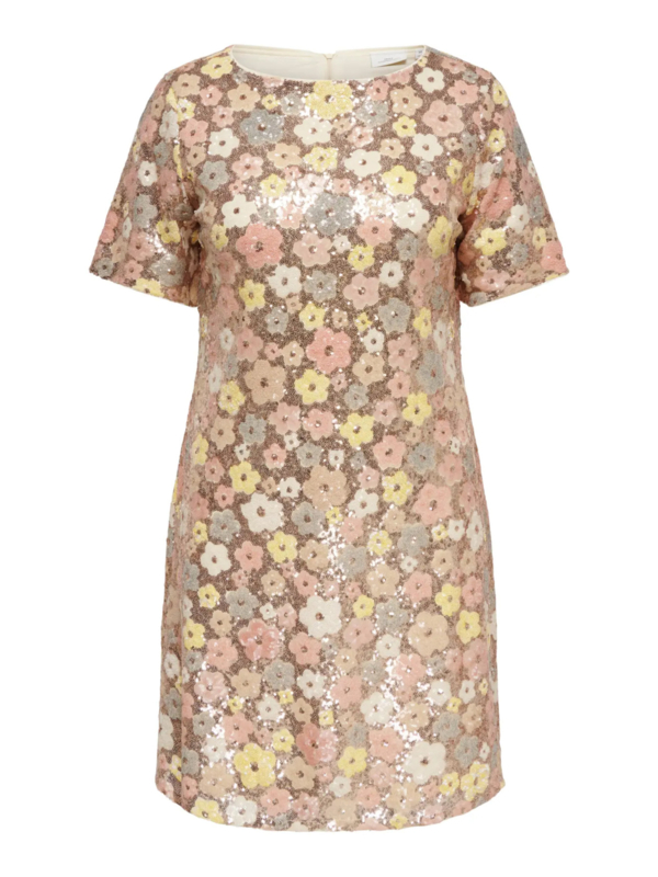 Sequins jurkje MabelleHele toffe jurk met bloemenprintje in pailletjes. Het jurkje heeft een ronde hals, korte mouw en ritsje in de nek. Het jurkje is op het lijf gevoerd zodat de pailletjes niet vervelen op je huid. Prachtig voor een bruiloft…
