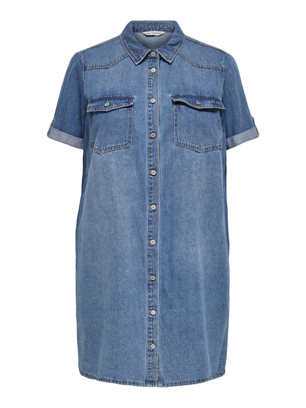 Jurkje FenjaTof jurkje van Vero moda curve in denim met een destroyed werkje in de stof. Het jurkje heeft een korte mouw, een kraagje en drukkers over de hele lengte.