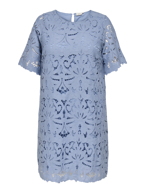 Broderie jurk GelinaPrachtige jurk in blauwe broderie kant. De jurk heeft een recht model met een ronde hals. In de nek sluit de jurk met een knoopje. De jurk is gevoerd op het lijf. Prachtig voor bijvoorbeeld een daggast op een bruiloft.