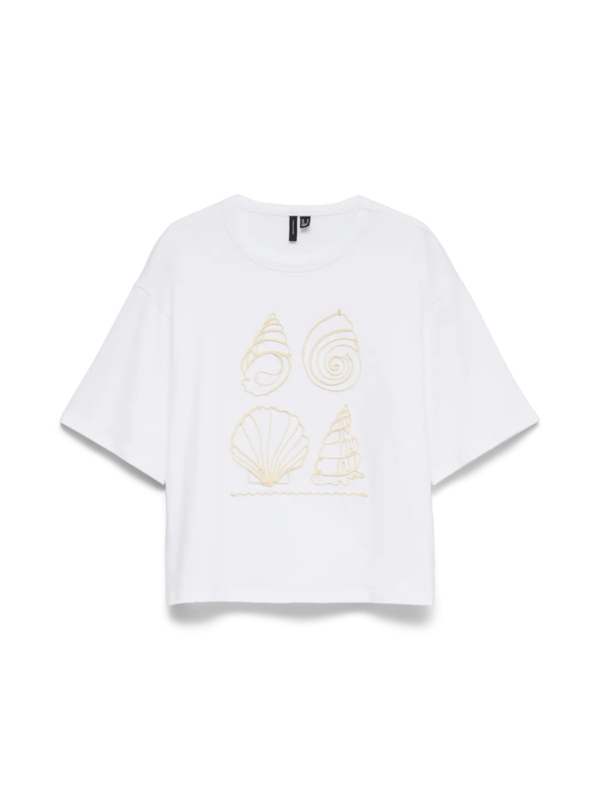 T-shirt Annia ShellLeuk t-shirt met borduursel op de linkerborst. De roze variant heeft een cognackleurige gebordurrd zonnetje en de witte een donkerblauw geborduurde schelp.