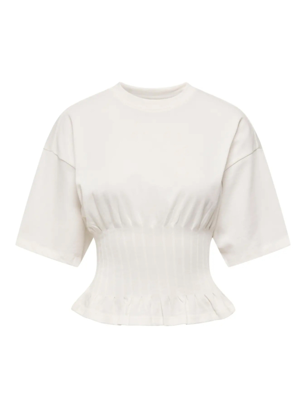 Shirt MarieLeuk t-shirt met smock in de taille en een klein ruffeltje aan de onderkant. De top heeft een ronde hals en een korte mouw. Verder valt de top wat korter, leuk op een high waist jeans(short).