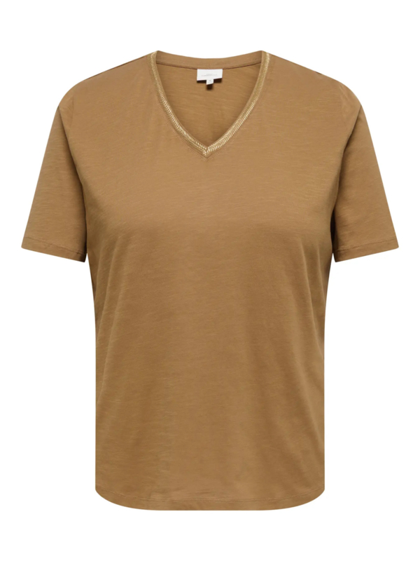 T-shirt TobiT-shirt in een camel kleur. Het shirt heeft een v-hals met een goudkleurige bies en een korte mouw.
