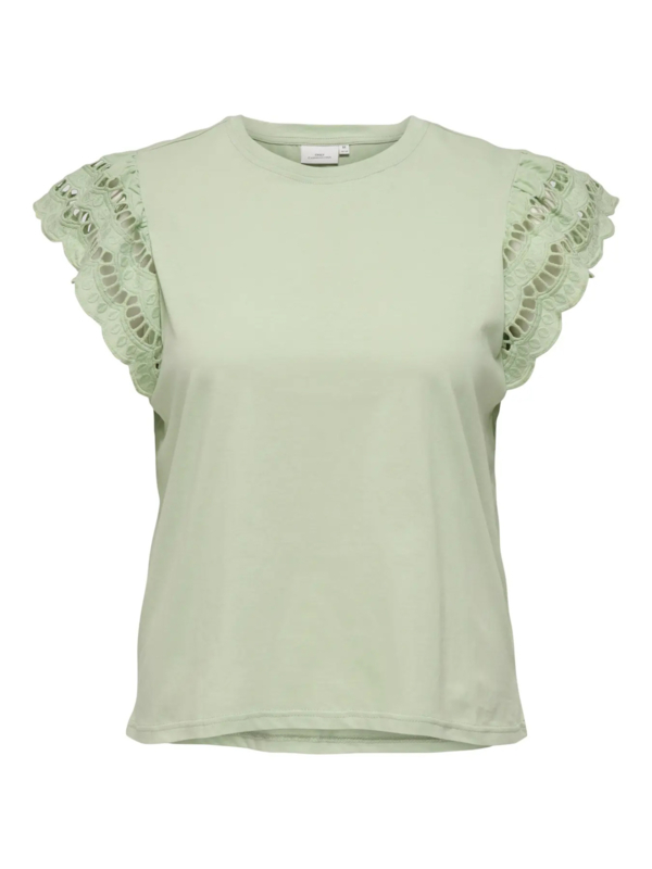 Top MacyLeuk t-shirtje met een kort broderie mouwtje en een ronde hals. In 2 kleuren verkrijgbaar.